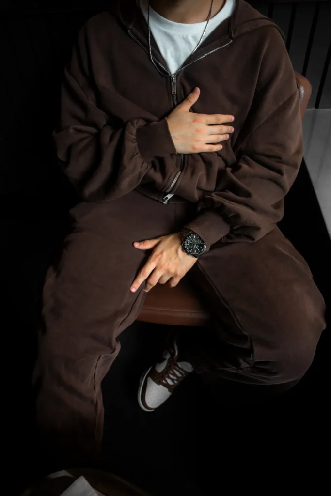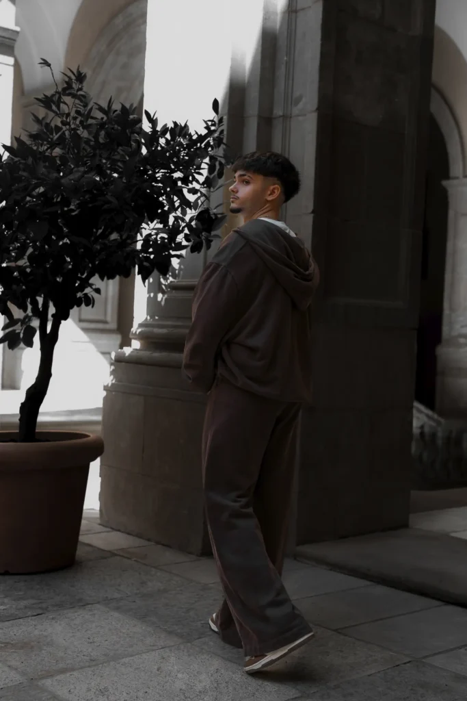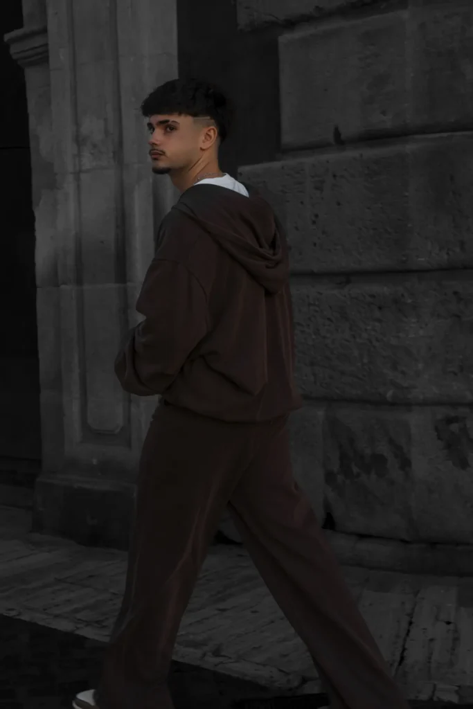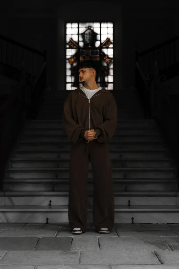Tonos oscuros y terrosos (como el taupe) simbolizan misterio y profundidad. La oscuridad sugiere lo oculto, lo que está por revelarse. Composición de la Imagen: La mano sobre el corazón es un símbolo de compromiso con uno mismo y con el camino que está por recorrer. Los detalles minimalistas en la ropa y los accesorios representan la conexión con lo moderno sin perder el enfoque simbólico.