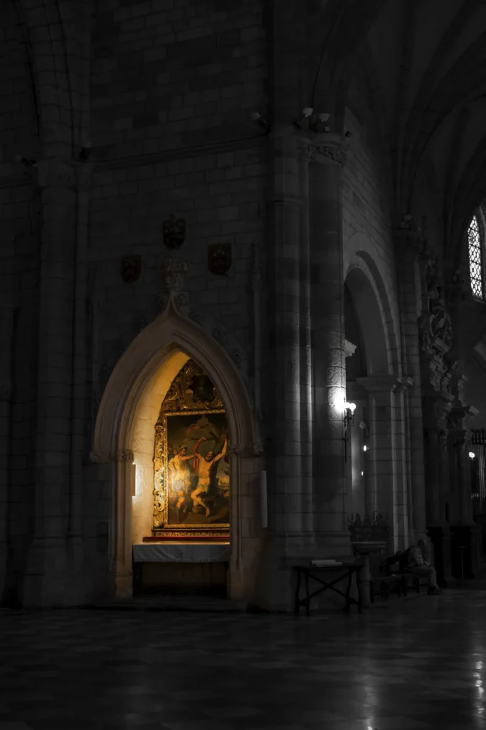 La iluminación tenue, con un enfoque dramático, alude a los claroscuros típicos del barroco, donde la luz revela lo esencial y la sombra oculta lo desconocido.